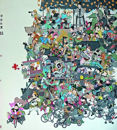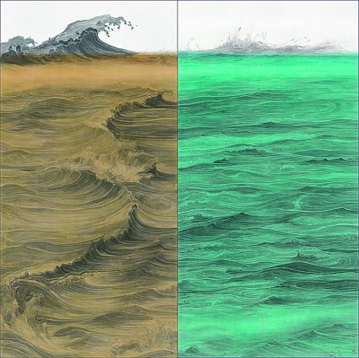 中国艺术家沈鹏的中国画《多彩世界》(图①)以兼工代写的方式,描绘了世界各国人民向着美好生活欢快奔赴的景象。王牧羽、王亮合作的中国画《大江大河》(图②)象征性地描绘出江河图景,同时展现了中华民族从跌宕起伏的历史苦难走向大路坦途的艰辛历程。来自阿尔及利亚的画家拉蕾姆·本菲萨则以丙烯描绘出橄榄叶的繁茂,恰似相交的不同肤色的手,诠释和平共处、共享美好世界的愿景。
