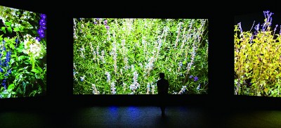 蓝紫、粉金、银灰、藻绿……站在意大利艺术家夸尤拉带来的《夏日花园》(图⑥)动态影像作品前,4K三联屏中的花花草草“随风而动”,一抹抹色彩忽而清晰忽而模糊,仿佛把人带入法国印象派画家莫奈的午后花园。作品借助一套庞大的技术装置,通过超高清摄像机与定制计算机软件,捕捉了人类主观视觉感受之外的机器之“眼”的观看景象。艺术家靳军的《描摹与共生——今日珍禽图》则采用交互科技多端同步,观众可亲手绘制属于自己的珍禽飞鸟,与名作中的群鸟相映成趣。