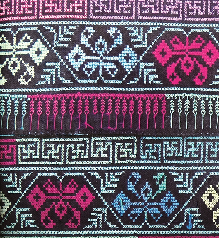 把三幅纹样连起来看,便是一条清晰的春日叙事链:玫瑰花苞写“将成”,珍珠花半开写“渐开”,牡丹盛放与蝶影写“盛而能动”。同样是花,因为载体不同而章法各异:头帕以团花定中,强调凝聚与祈愿;袖缘以连续成带,强调节律与行走;长巾以中心与角隅合围,兼顾铺陈与收束。民间纹样并非随意装点,而是在可穿戴的结构上安排时间与愿望:把花期写进衣物,把生长写成章法,把祝愿落到日用之物中。