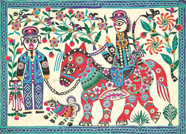 试看陕西安塞剪纸代表性传承人高金爱的剪纸作品《马》,身生双翼、平步青云的造型,延续了汉代“翼马”的超验想象,展现出突破生活困境的世俗愿望;来自内蒙古的剪纸作品《飞马》中,马儿柔韧灵活、步伐昂扬的姿态,是雄健生命力的生动表达;库淑兰的作品《南岸子上来马队啦》描绘了农村常见的马队景象,马匹的动态、人物的神态,结合艺术家标志性的“彩贴剪纸”技法,营造出饱满多彩的装饰风格,让人感受到热闹与欢快。库淑兰将日常生活场景转化为充满仪式感的叙事,不仅是对美好生活的赞颂,更是其“万物有灵、物我合一”艺术观的体现,以象征性的饱满色彩表达出精神启示的意向。这些剪纸创作并非异想天开,而是对传统文化符号的创造性转化,传递出人们的精神信仰与生存智慧。作品中那些生动的造型与丰富的色彩,是对生命能量的深刻诠释与艺术感悟的即兴表达,旨在给予人们强大的精神力量与坚定信念。