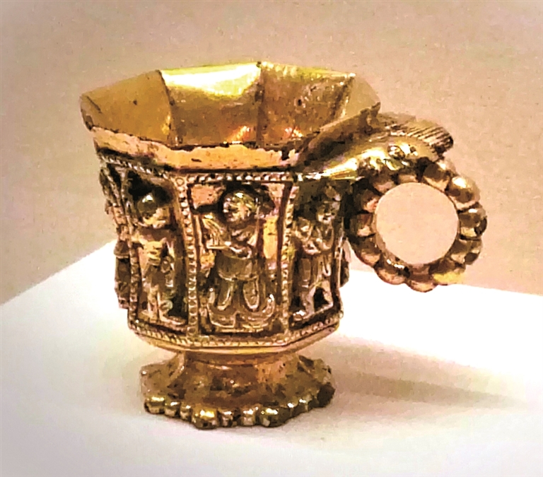 西安何家村窖藏出土的伎乐纹八棱金杯(唐)光明日报记者李韵摄/光明图片